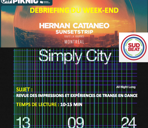 En d’autres termes, pour ceux qui découvrent peut-être ce Dj, sachez que SIMPLY CITY publie et joue sa musique au travers le monde AVEC le label de Cattaneo, SUDBEAT. C’est pour cela que si l’on ajoute ses dix heures de jeux aux six heures de Cattaneo, Montreal a donc eu droit 16h de l’esprit sud-américain de SUDBEAT ce vendredi 13 septembre, avec ses magnifiques structures progressives, longues et puissamment articulées.