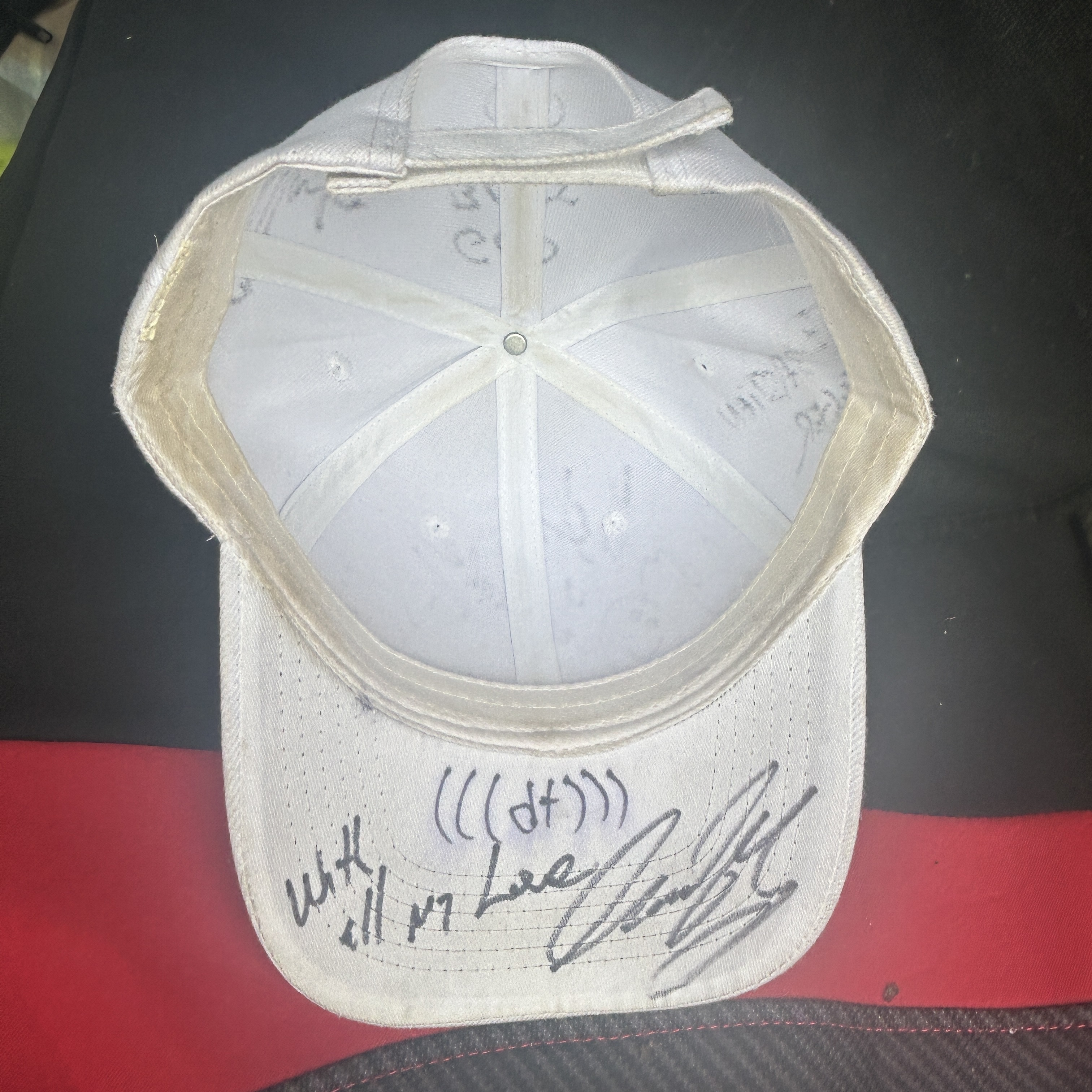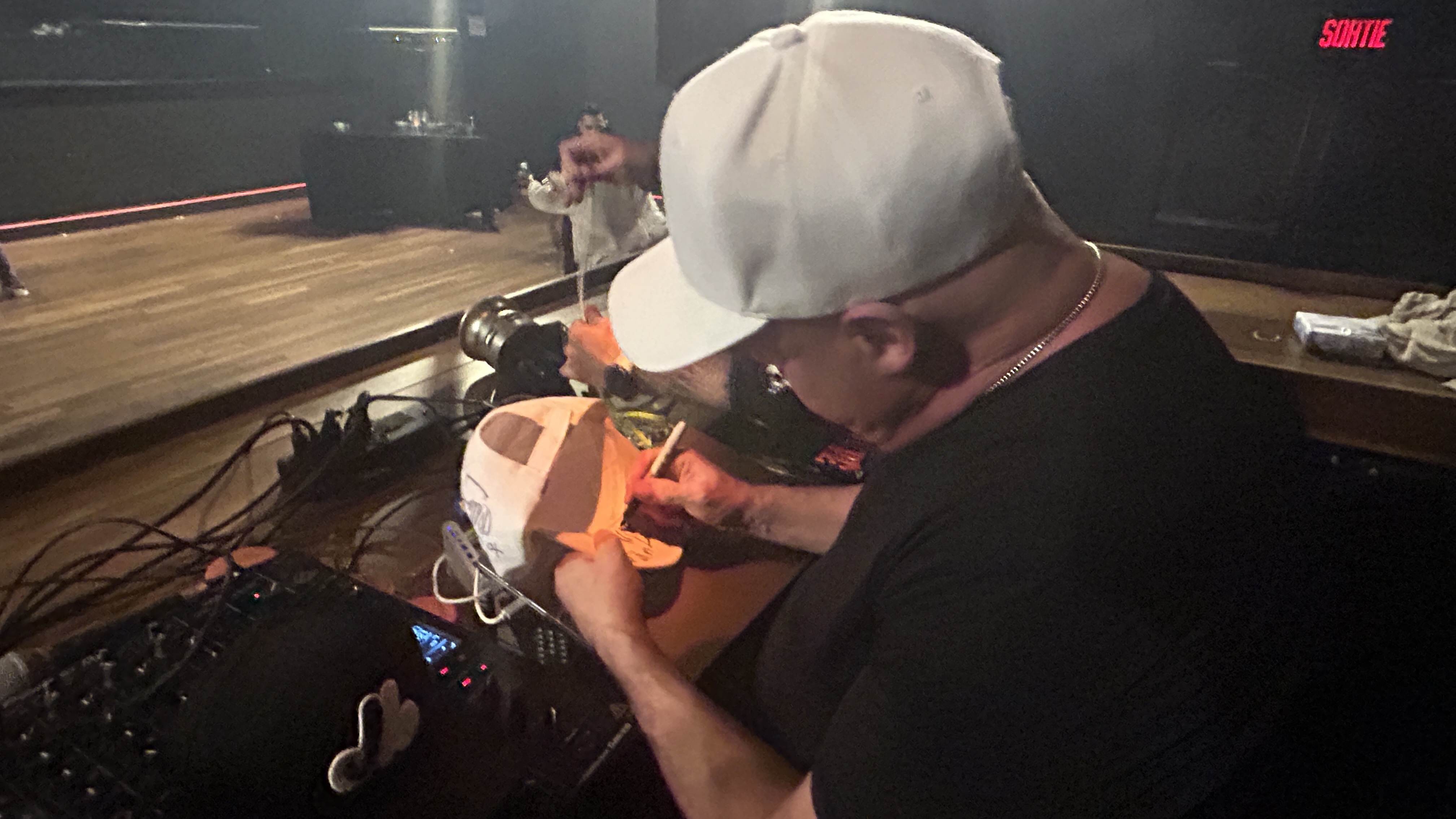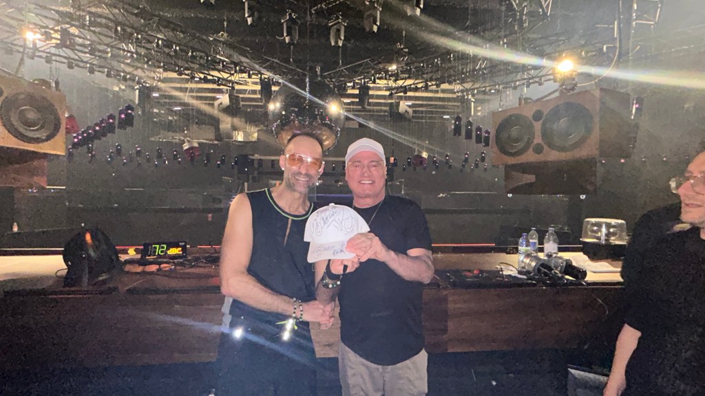 **THE FAMOUS STEREO SIGNATURE CAP: This one had been given away by DT in 2019 to a hundred or so people, and my friend Arnaud (pictured Left) had picked one up for me saying « Chris, do something with it », and over the years I had it signed by Angel Moraes, Chus&Ceballos, Guy-J, John Digweed, Hernan Cattaneo, Victor Calderone, Sebastien Léger, Markus Schulz, Sharam and Dubfire (Deep Dish) and finally back to DT 5 years later for a grip adjustment. What a pleasure it was to re-fit his cap 🙂