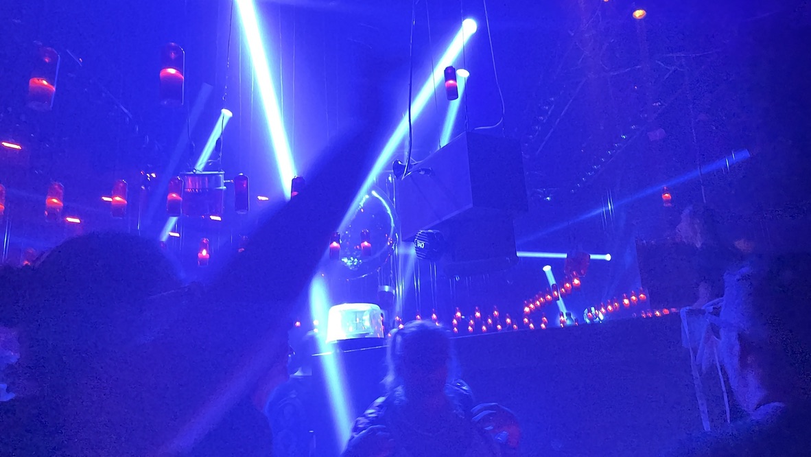 Il y a eu, entre autres, à un certain moment, une séquence stroboscopique hallucinante, en croisement rouge/bleu à vitesse absolument phénoménale, exactement sur le beat de la toune, qui nous a littéralement expulsé à l’extérieur de nous-mêmes, propulsés dans la Grande Conscience qui nous surplombait. Tout le monde était extatiques, et ce que je vous raconte là, je ne l’ai perçu qu’au travers la fente de mes yeux, tournés vers mon intérieur et ma propre euphorie entourée d’euphorie!
